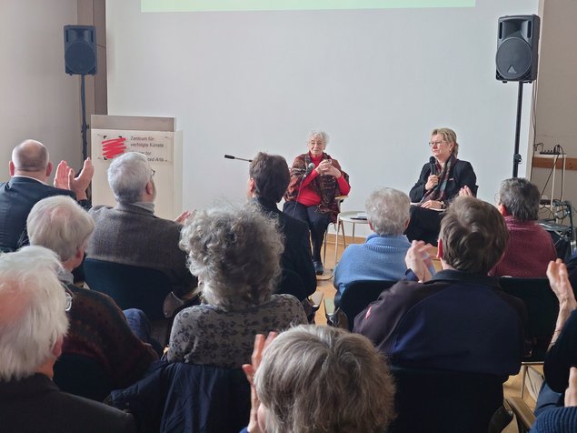 Am 29. Januar besuchte im Rahmen eines Martinees mit Ruth Weiss eine Zeitzeugin das Zentrum für verfolgte Künste. Sylvia Löhrmann hatte in ihrer Funktion als Vorsitzende des Förderkreises des Zentrums Weiss eingeladen. Bürgermeister Thilo Schnor durfte Frau Weiss für Solingen herzlich willkommen heißen. In Form eines Interviews zwischen beiden Frauen sprach die heute 98-jährige Weiss sodann vor rund 160 interessierten Zuhörerinnen und Zuhörern über ihr bewegtes Leben und als Jüdin zu Zeiten des Nationalsozialismus. Zwei Tage zuvor war sie anlässlich des Holocaust Gedenktages Ehrengastrednerin im Landtag NRW. Ruth Weis musste Deutschland 1936 verlassen und landete mit ihrer Familie in Südafrika. Dort erlebte sie ein Apartheidsregime, gegen das sie sich später engagierte. Sie lernte in ihrem Kampf viele Freiheitskämpferinnen und –kämpfer, u.a. Nelson Mandela, kennen.