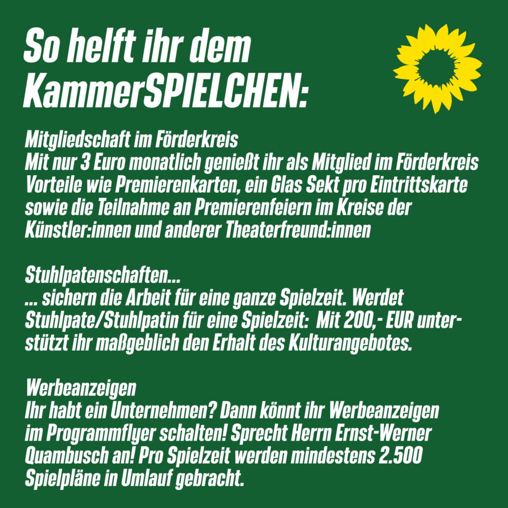 Wenn ihr wollt, dass das KammerSPIELCHEN weiterhin mit seinen interessanten und unterhaltsamen Produktionen sowie professionellen Schauspieler:innen und Regisseur:innen betrieben werden kann, ist auch Eure Mithilfe sehr willkommen – und gleichzeitig ganz einfach.