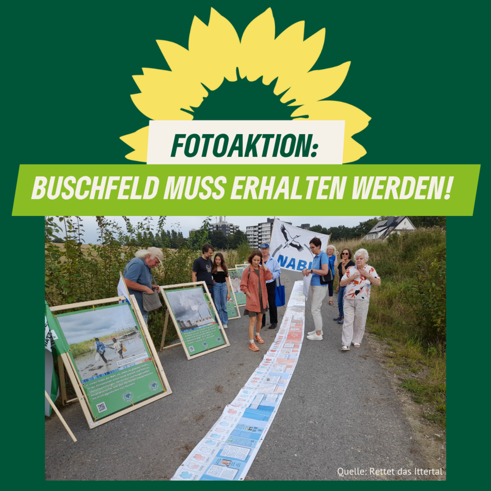 Als Zeichen für den Umweltschutz und Erhalt der landwirtschaftlichen Fläche Buschfeld, haben sich fünf Initiativen zusammengeschlossen und eine Fotoaktion umgesetzt. Parents for Future, NABU, BUND, OLX35 und die BI Rettet das Ittertal fordern gemeinsam eine endgültige Durchsetzung des bereits bestehenden Ratsbeschlusses, das Gebiet Buschfeld im Regionalplan des Regierungsbezirks Düsseldorf wieder als landwirtschaftliche Fläche auszuweisen. Erfolgt dies nicht, bleibt das teilweise landwirtschaftlich genutzte Gebiet weiterhin gefährdet in Zukunft in nicht notwendiges Gewerbegebiet umgewandelt zu werden.