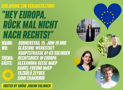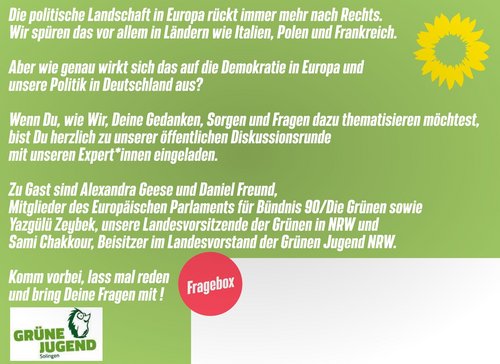 wir laden dich ein zu unserer Veranstaltung "Rechtsruck in Europa" am Donnerstag, 15. Juni 2023, 19 Uhr, in die Gläserne Werkstatt, Hauptstr. 61 - 63, Solingen.