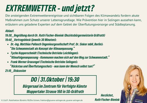 Die ansteigenden Extremwetterereignisse und sichtbaren Folgen des Klimawandels fordern akute Maßnahmen zum Schutz unserer Lebensgrundlage. Wie Prävention hier in Solingen aussehen kann, erläutern uns geladene Experten auf dem Gebiet der Überflutungsvorsorge und Städteplanung.